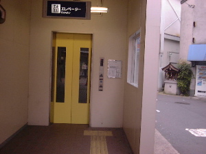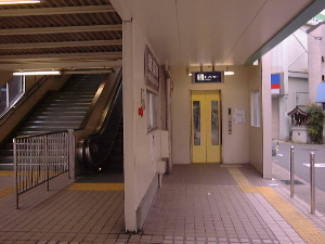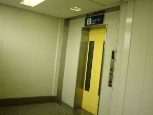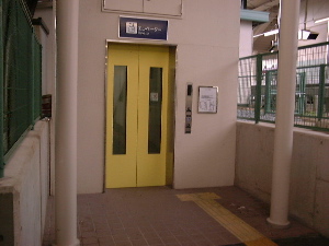 | この駅のエレベーターは全て「通り抜け式」とよばれる型のもので、エレベーターに乗ると向かい側にもドアがあり、2階(または1階)に着くと向かいのドアが開いて降りる。車イスで乗っても、エレベーター内で向きを変えたりバックで降りずに、着いたらそのまま前に進めばよい。 | ||||||||||||||||||||||||||||
