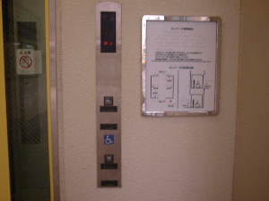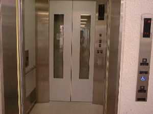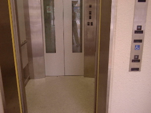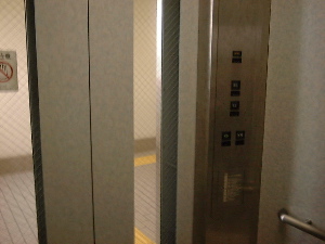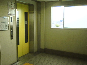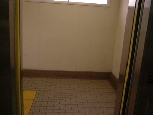 | 階段の隣りにエレベーターがある。「通り抜け式」なので向かい側にもドアがある。 | ||||||||||||||||||||||||||||