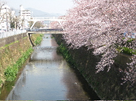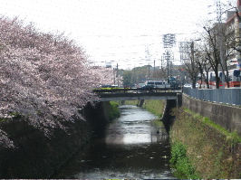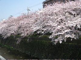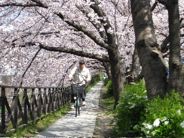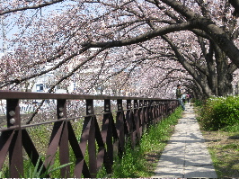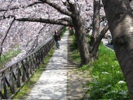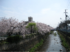 | この桜は満開だろうか。遊歩道の外からも、とてもきれいな桜が楽しめる。 | 桜を見物しながら、ぶらぶら歩くこと約2時間。ようやく四条天神川に到着。桜並木はこの先も北へ続いているのだが、今回の花見はここでおヒラキ。 この天神川の桜並木、本当にきれいな所で混雑もしないので、「穴場」です。 みなさんも来年のお花見に、いかがでしょうか。 |