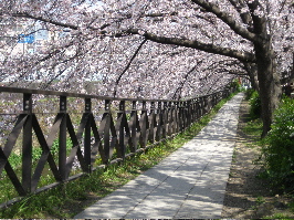 | 阪急西京極駅から北へ。五条天神川通の川を挟んで東側の遊歩道。そこに桜並木があった。ずーっと四条通を超えて御池通の先まで続いているのだろうか。 | 見事な桜のトンネル。 先までいったい何本の桜の木が植えてあるのだろう。 遊歩道の向こうまで桜一色。 |