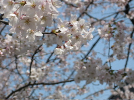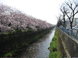 | 今日は快晴でホントに気持ちいい。真っ青な空に桜の花がよく映える。 | 高辻通りに架かる橋から五条方面を望む。美しい桜並木がとぎれることなく延々と…。 | ||||||||||||