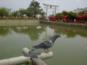 | 参道を池のほとりから撮影。参道のトンネルの外にもツツジがあふれるように咲いている。それが水面にも映り、とてもきれいだ。 | |||||||||||